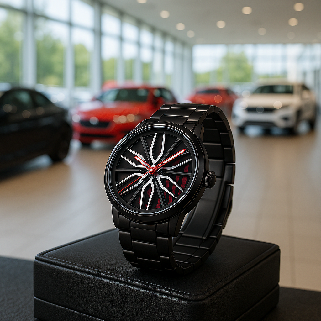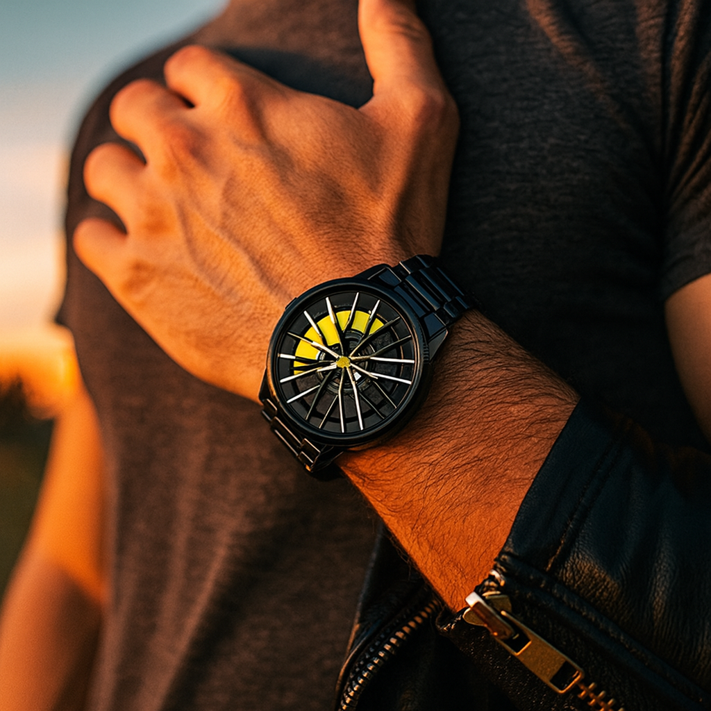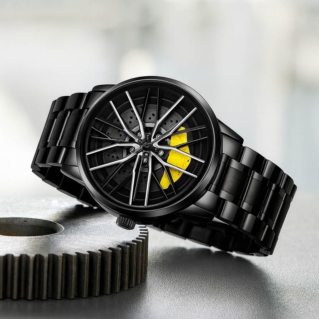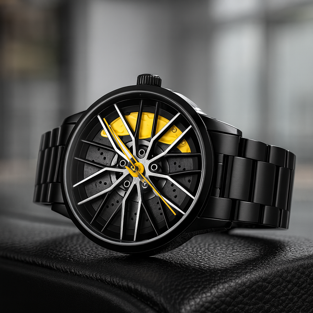 Entdecken Sie eine Uhr, die nicht nur die Zeit anzeigt, sondern ein Statement setzt. Das innovative Zifferblatt im Felgen- und Bremssattel-Look macht diese Uhr zu einem echten Highlight am Handgelenk. Hochwertige Materialien, präzise Verarbeitung und ein markantes Design sorgen für einen stilvollen Auftritt bei jeder Gelegenheit.